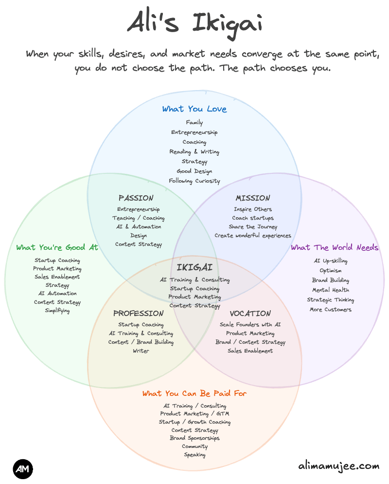 The ikigai surprised me. Not because the circles were hard to fill. Because the overlap was so obvious I almost missed it.