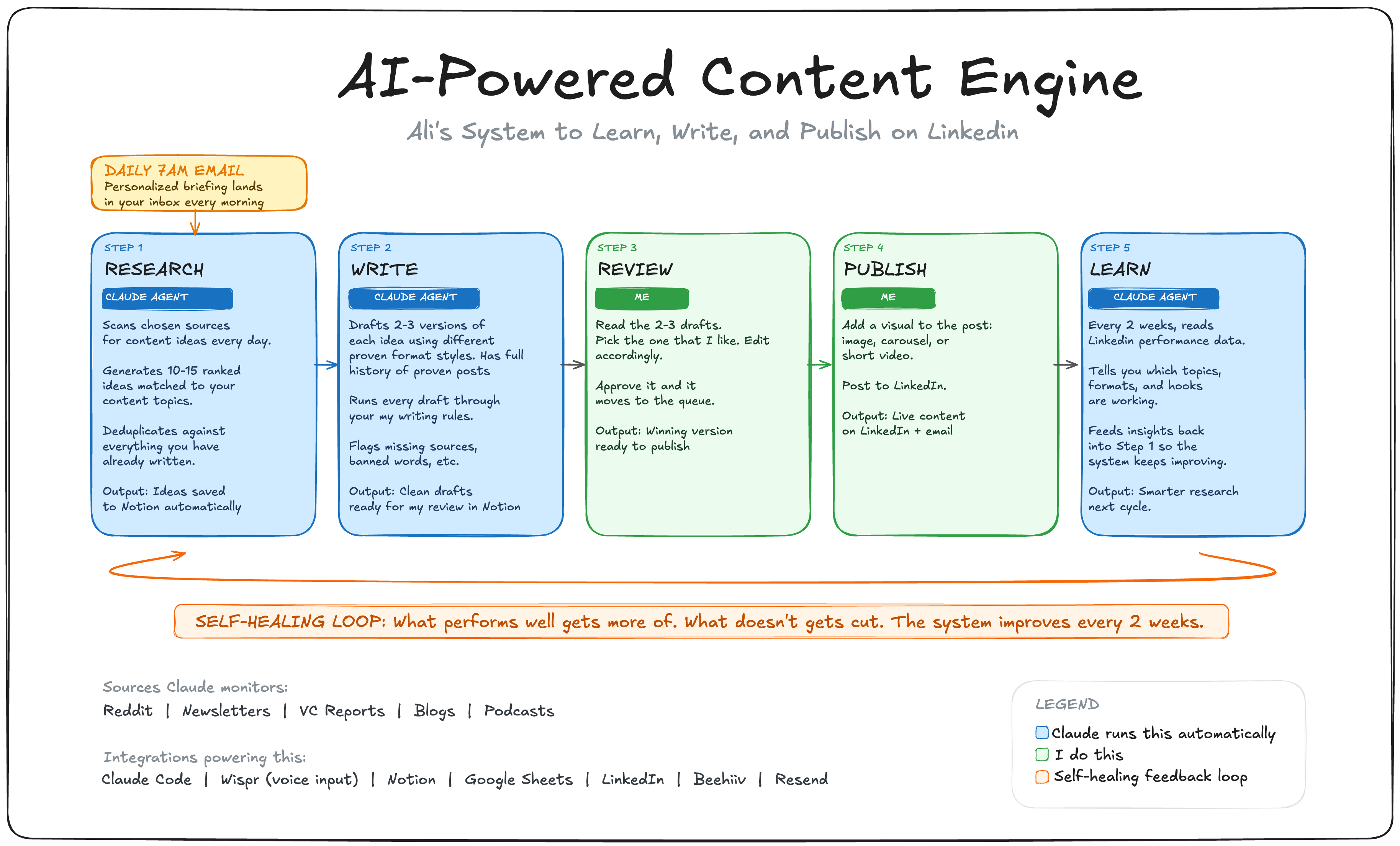 The orange loop at the bottom is probably the coolest part I am super proud of building. Every two weeks, the agent reads my LinkedIn performance data and feeds metrics & insights back into Research phase. What performed gets more weight. What flopped gets cut. The loop turns a tool into a system that improves over time.