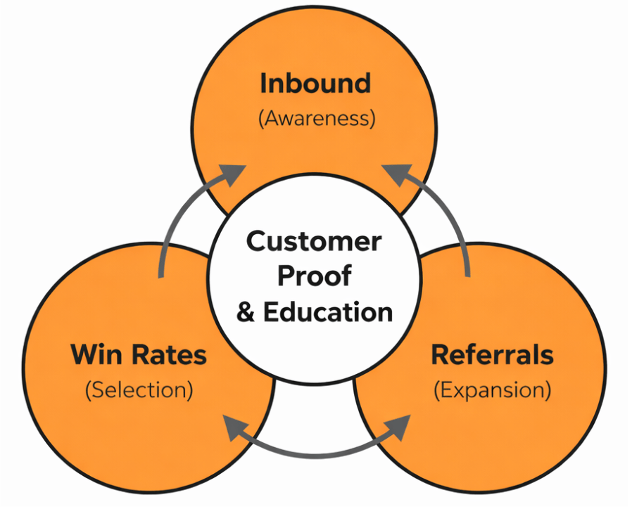 Proof second. Build an inbound content motion around case studies, ROI stories, guides, battlecards, industry landing pages, shareable assets. The stuff that helps champions sell internally and gives happy clients something to forward.